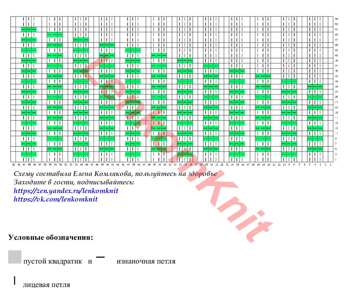 На рисунке - схема узора. Он как бы расширяется от правого края в сторону левого, но только по верху. А внизу узор идет по одной линии. Я выделила зеленым цветом петли изнаночной глади, чтобы было лучше видно узор, как он располагается.