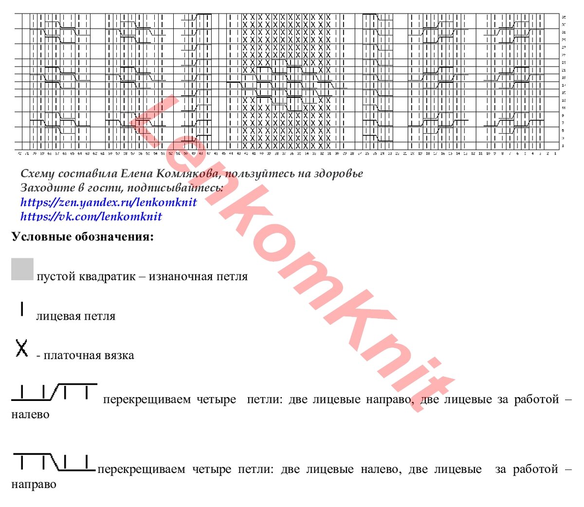 Схема узора - на рисунке. Во всех косах (кроме узких, из четырех петель) перекрещивание идет не за один раз, а поэтапно (чтобы полотно не стянулось и было мягким).
