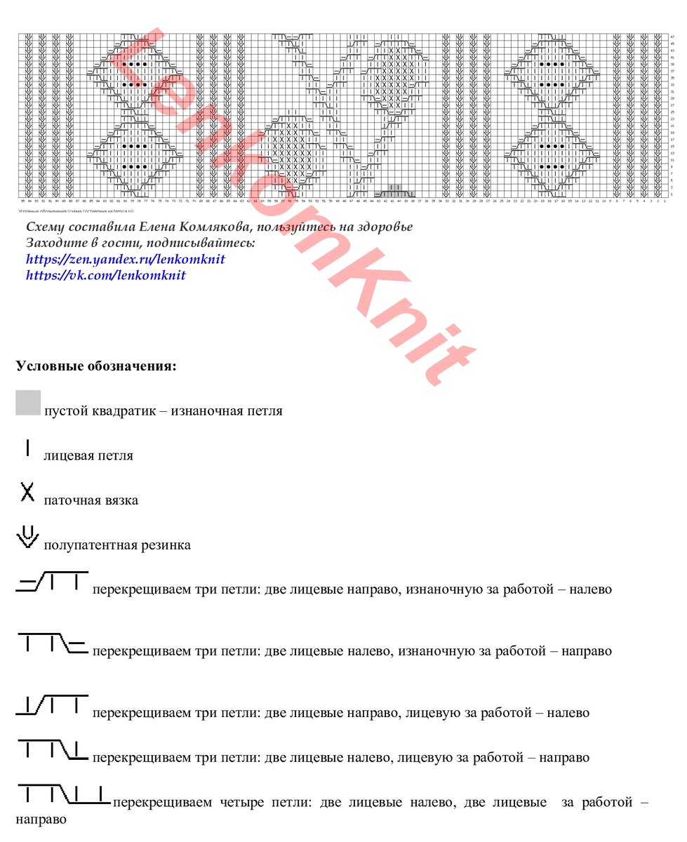 На рисунке - схема узора. По краям центрального узора вывязываются удлиненные ромбики (это получится, если петли перекрещивать не в каждом лицевом ряду, а через ряд).