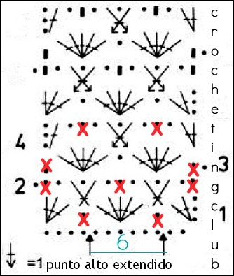 Leemos de izquierda a derecha. Vamos con la única complicación que tiene esta muestra, el punto alto extendido y cruzado. Estamos en la vuelta 4, y este punto hay que tejerlo entre la vuelta 4 y la vuelta 2.