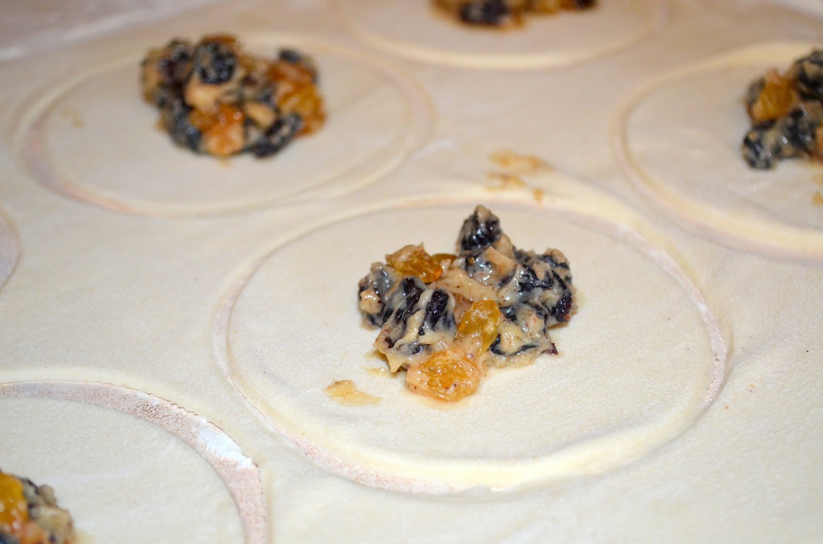 3. раскатать тесто не очень тонко и большой кружкой вырезать 10-12 кружков, на каждый кружок кладем по 1 ст ложке начинки