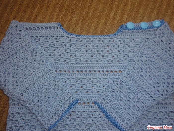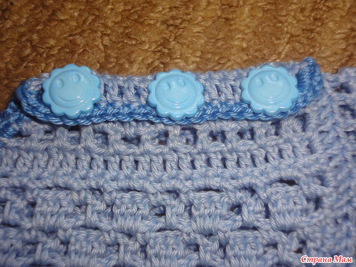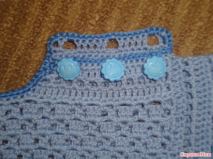 так как я решила пуговки делать на плечике, то на левом плечике связала еще три ряда полустолбиками с накидом, во втором ряду сделала "дырочки" для пуговиц..