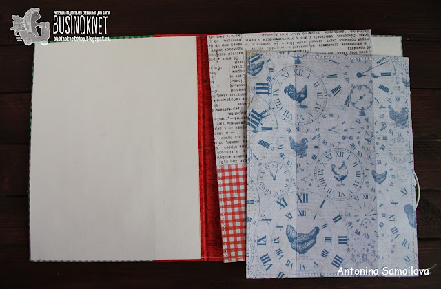 Клеим форзацы из скрапбумаги. Предварительно делаю на них декоративную строчку. Следите за тем, что бы из под скрапбумаги не торчал слой картона.