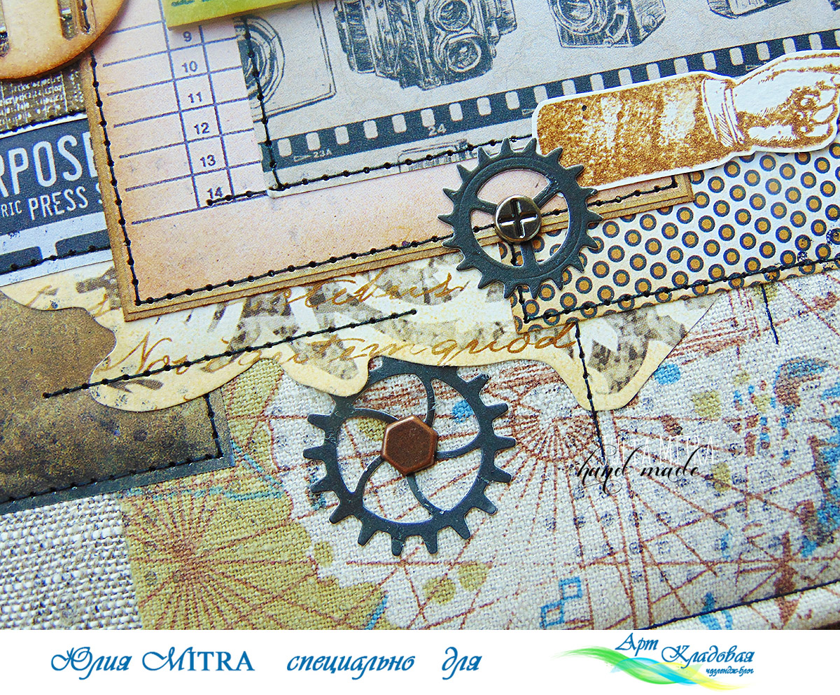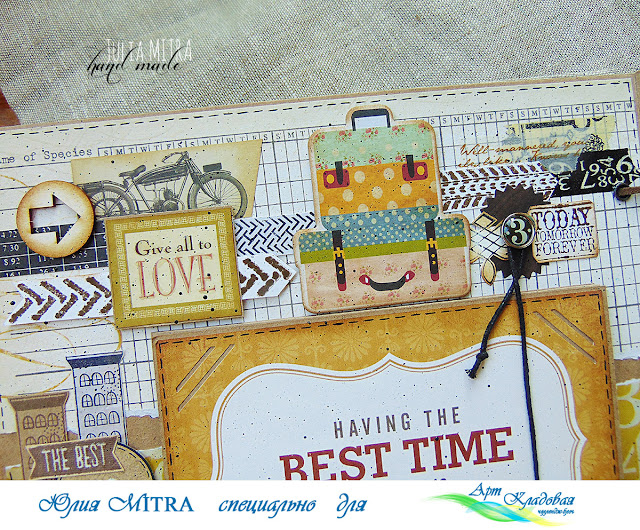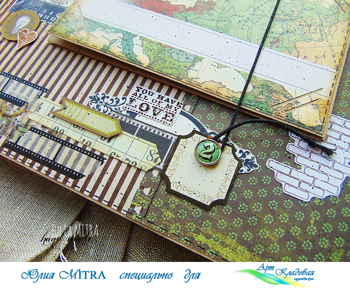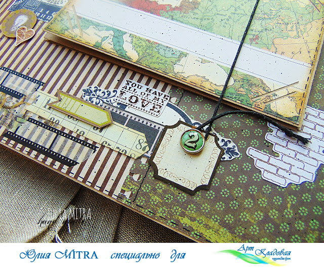 Основа - плотный лен, который я местами проштамповала фоновым штампом-уголком из серии "Гранжевые фоны". А дальше уже пошли горы бумажек и украшений - например, рамочка-кадр - чипборд с сердечком, на которую я нанесла еще один штампинг-надпись Travel Book, а после покрыла ее деко-глазурью цвета Оливка.