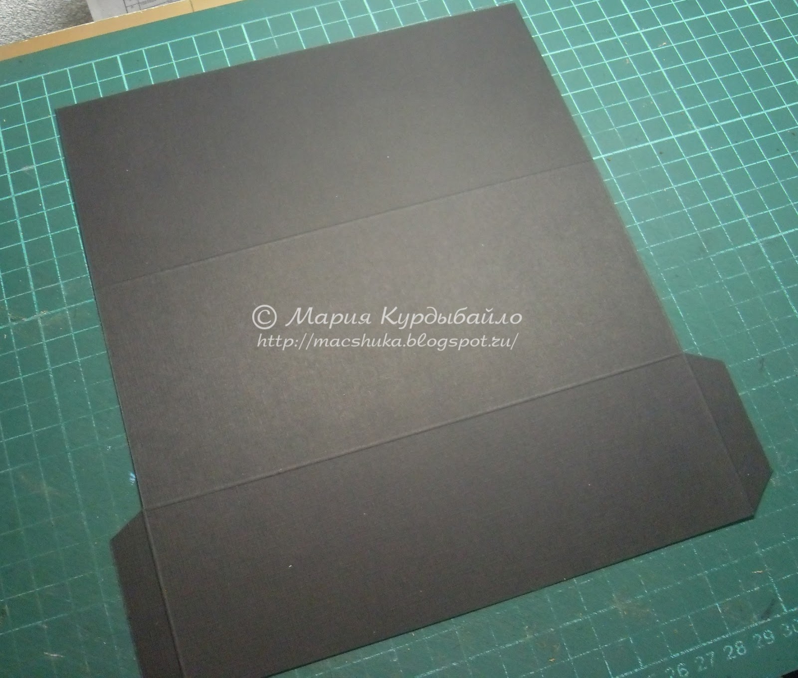 Затем по той же линии биговки отрезаем крайнюю часть под клапан. Бигуем заготовку вдоль с отступом от краев по 1,5 см.