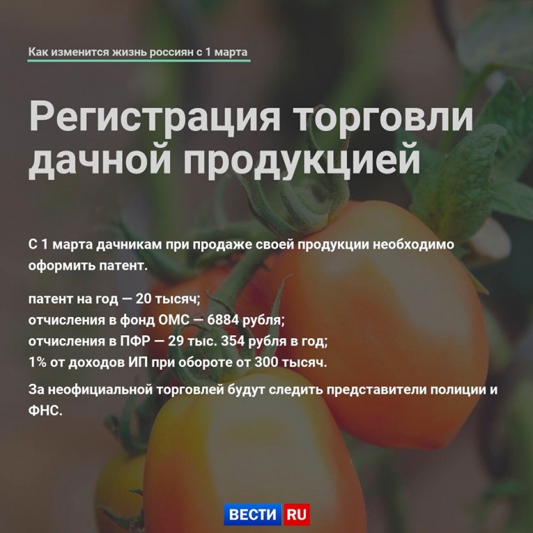 С 1 марта 2019 года вступает в силу (начинает действовать) новый закон, регламентирующий продажу излишков продукции, выращенной гражданами РФ на своих дачах\огородах или в личном подсобном хозяйстве, и получивший в народе название «налог на огород».