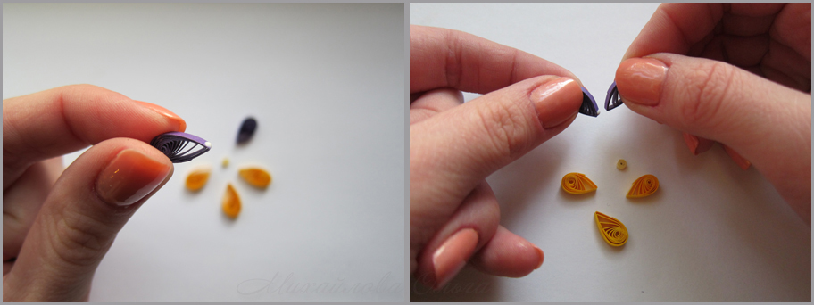 Чтобы сделать цветок фиалки, нам потребуется 2 элемента "капля" фиолетового цвета (если забыли как делать, можно подсмотреть), 3 элемента "капля" желтого цвета и одна тугая спираль. Я использовала полоски длиной 15 см, на одну "каплю" - одна целая полоска. Для серединки, она же тугая спираль или ролл, берем четверть полоски, причем вдоль по всей длине разрезаем пополам, чтобы ширина была не 3 мм, а 1,5 мм. В итоге на один цветок у нас будут заготовлены следующие части: