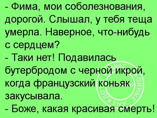 — Только что звонили «из полиции». Говорят, что мой сын угнал мою машину, напился и попал в аварию. Ну, и как всегда, чтобы замять, надо отвалить бабла.