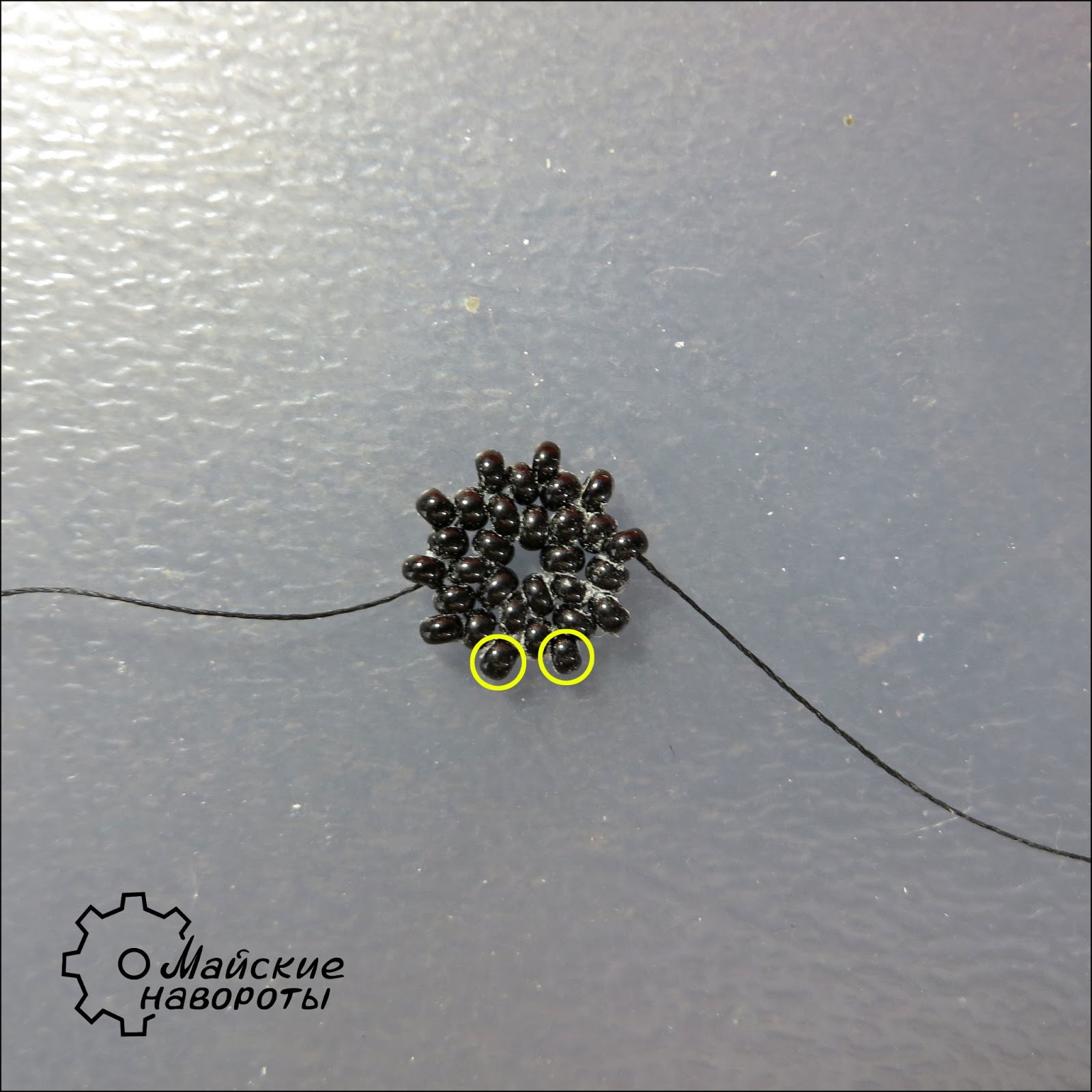 3. Второй ряд. Воск/парафин в процессе плетения будет не так очевиден и весь останется на руках.4. Третий ряд, шаг в 2 черных бисерины. Здесь и далее желтыми кружочками (одна бисерина за шаг) и овалами (две бисерины сразу) будет указан паттерн ряда, чтобы лучше тебя видеть, деточка не потеряться на мяче.5. Четвертый ряд, шаг в 1 черную бисерину:
