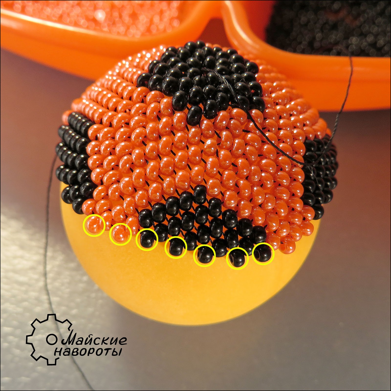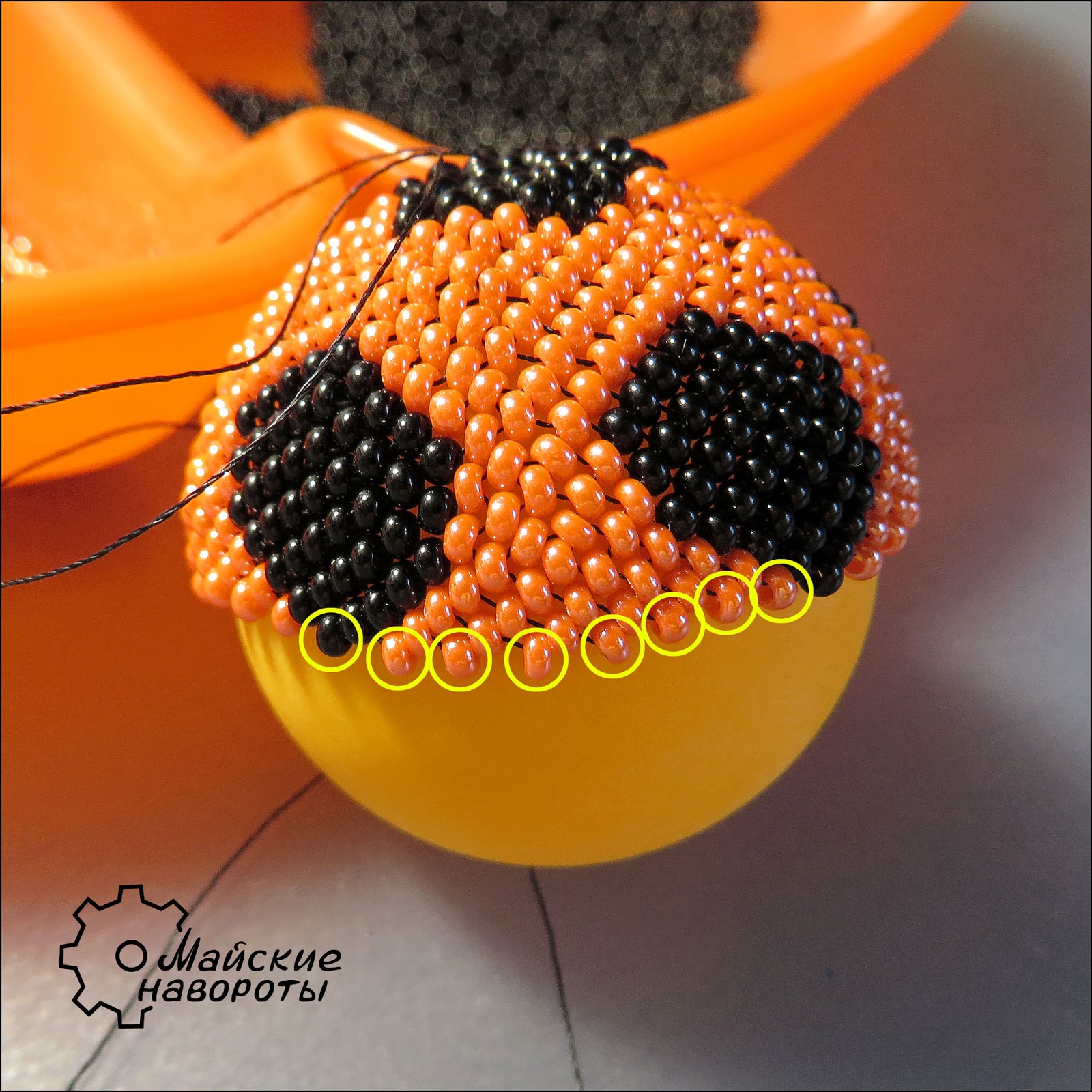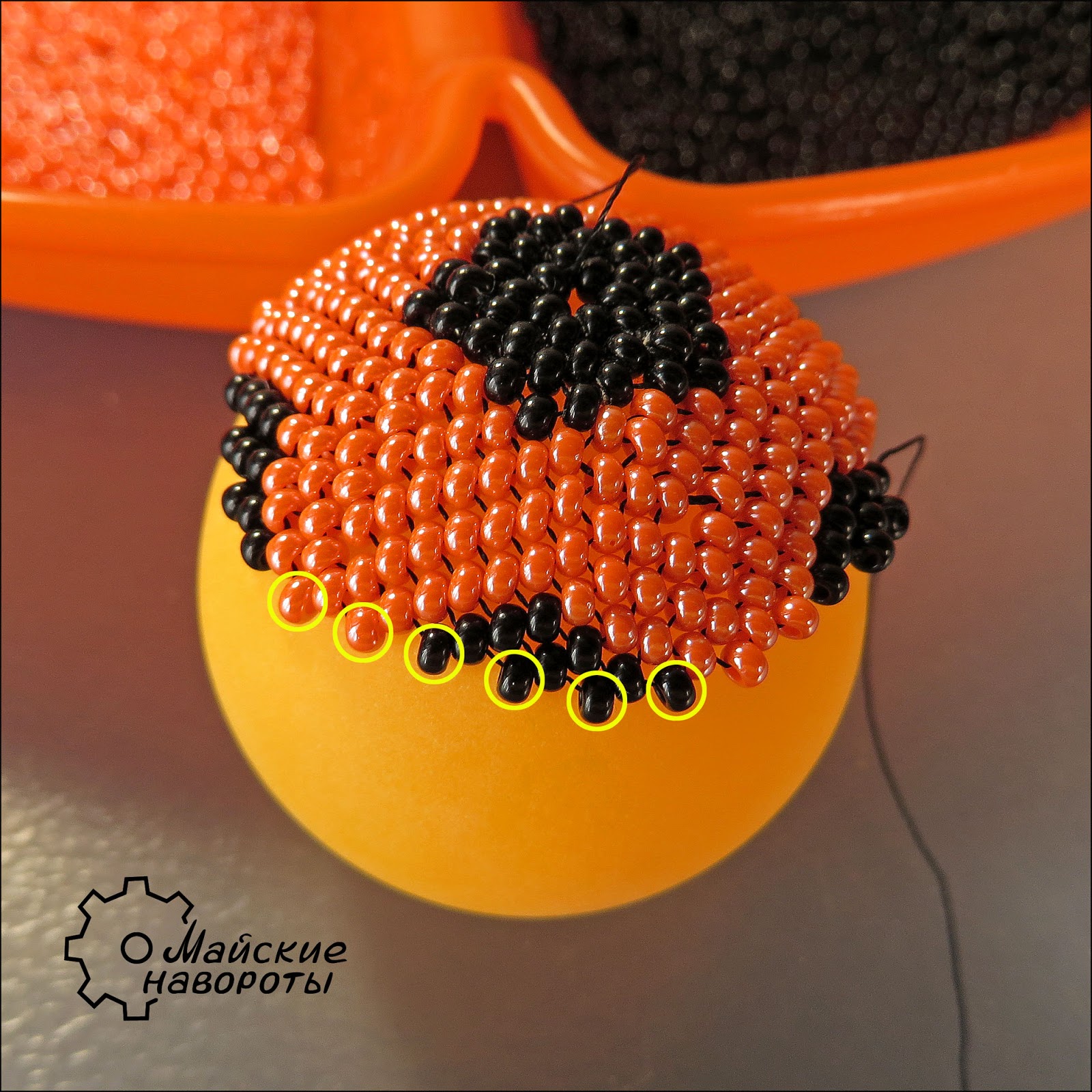 7. Шестой ряд. 1 черная - 2 оранжевые. Надеюсь, читатели мастер-класса знакомы с мозаичной техникой плетения по кругу, и видят, что шаг в 2 оранжевые бисерины шестого ряда находится над шагом в 2 черные бисерины третьего ряда. Далее я на этом внимание заострять не буду - ориентироваться предлагаю за счет сравнения вашего плетения с картинкой.8. Седьмой ряд, шаг в 1 оранжевую бисерину.