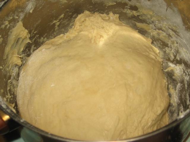 Замешиваем мягкое тесто. Много муки сыпать не надо. Как только тесто начнёт отлипать от стенок кастрюли, прекращаем его меситью