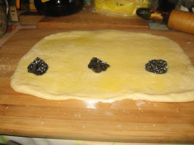 Смазываем растопленным сливочным маслом. Посыпаем сахаром, немного. Я положила ещё 3 ягодки чернослива без косточки.