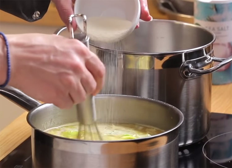 И последний ингредиент – манка. Она даст супу насыщенность и густоту. Для нашего количества бульона потребуется 2,5 ложки манки. Добавляем ее в наш сотейник и варим несколько минут, перемешивая.