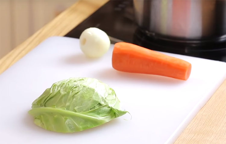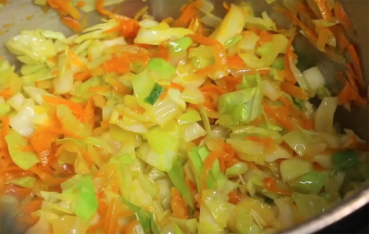 Сначала готовим овощи. Морковь, лук и капуста – режем мелко и добавляем все в сотейник. Пожарим сразу в нем, так мы сэкономим время и испачкаем меньше посуды.