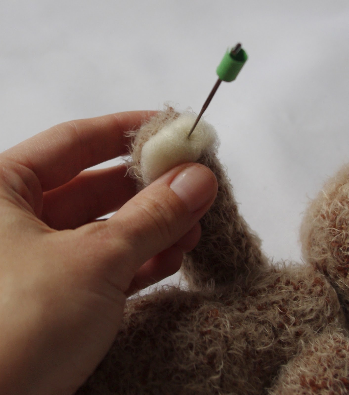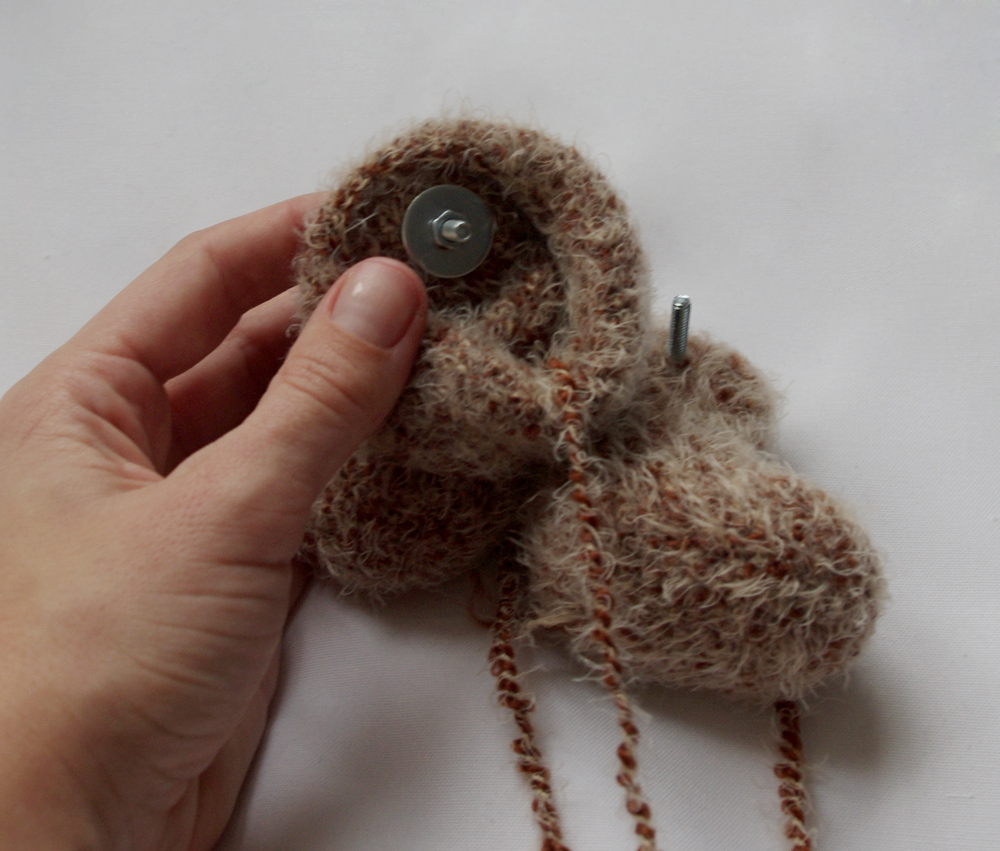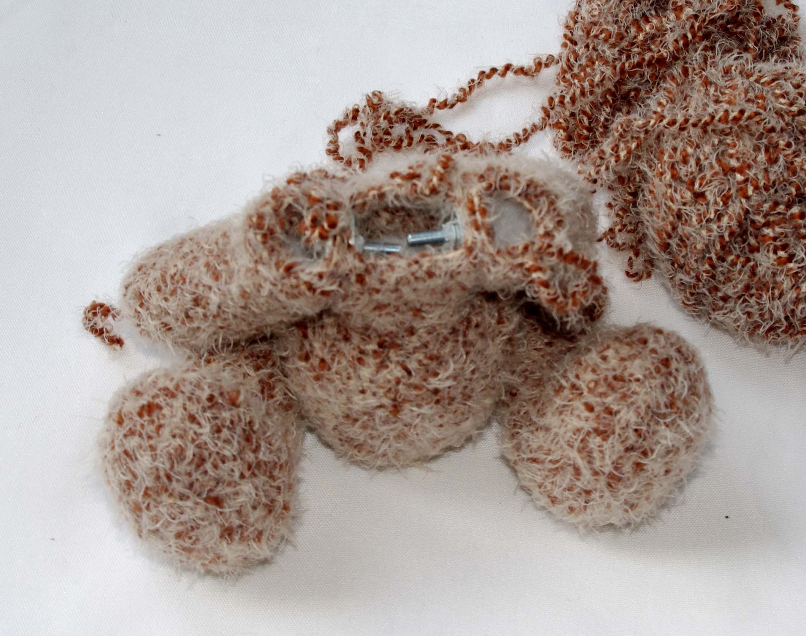 Соединение у нас болтовое. И чтобы оно не рескрутилось, наматываем нитку на болт вплотную к шайбе и ромазываем клеем. Набиваем ножки до конца и закрываем, провязывая по 2 стбн вместе пока вязание не закроется.
