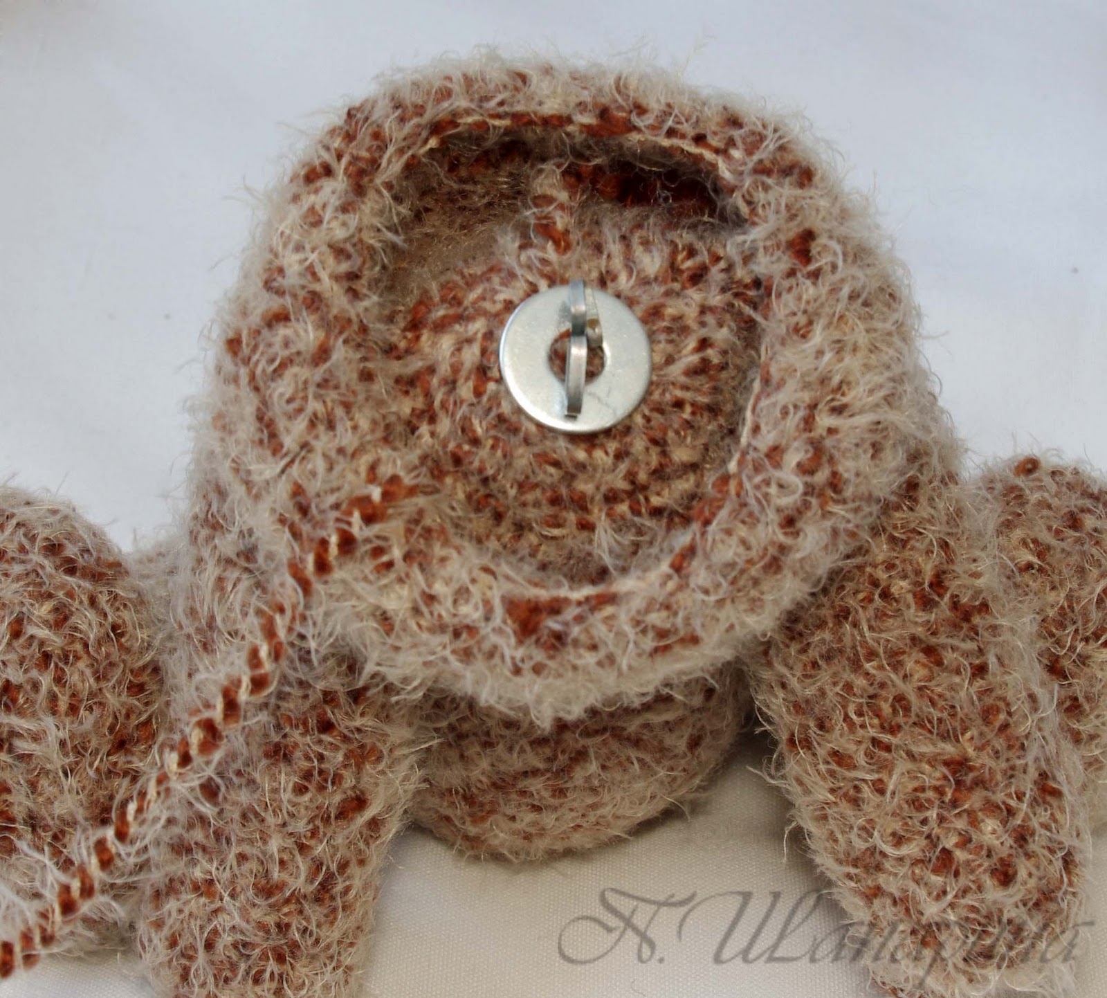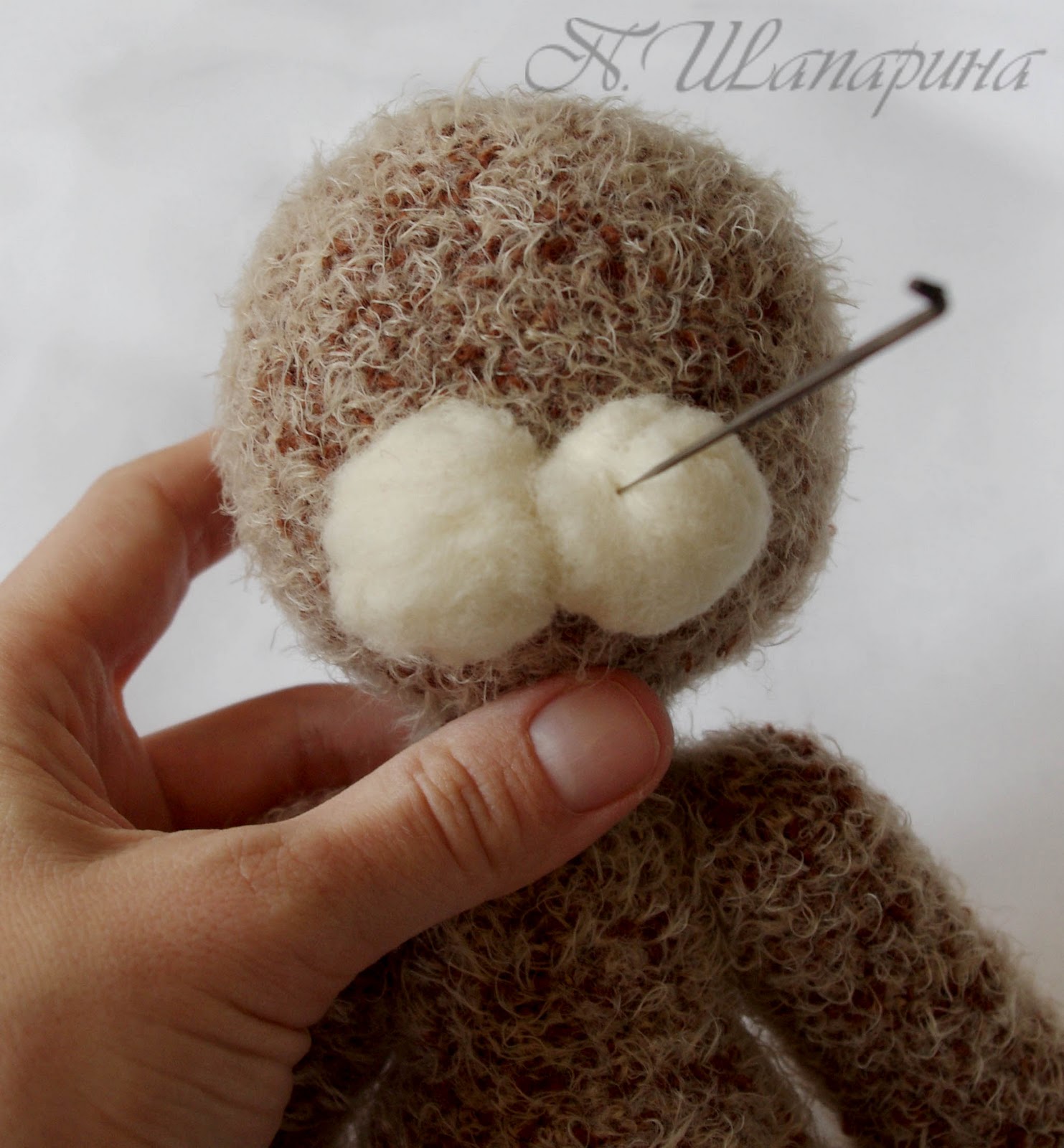 аналогично ножкам, крепим ручки.... набиваем и закрываем как и ножки. Довязаваем 4 ряда для шеи