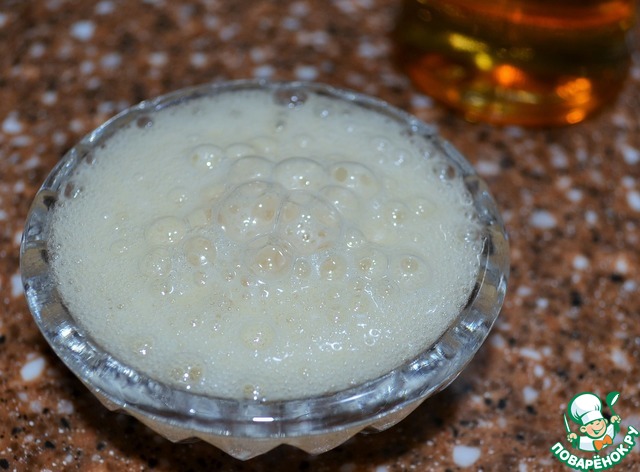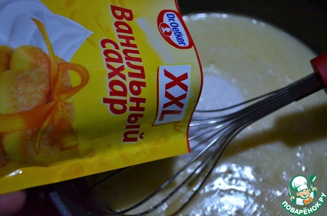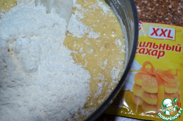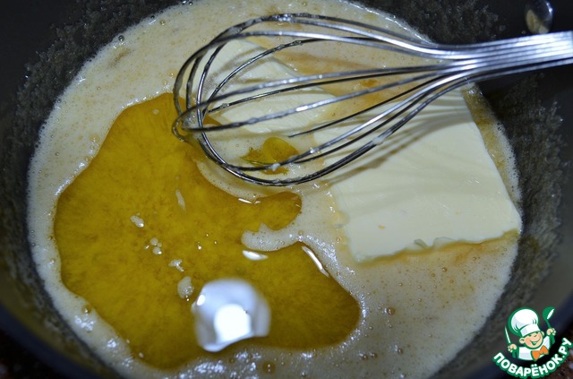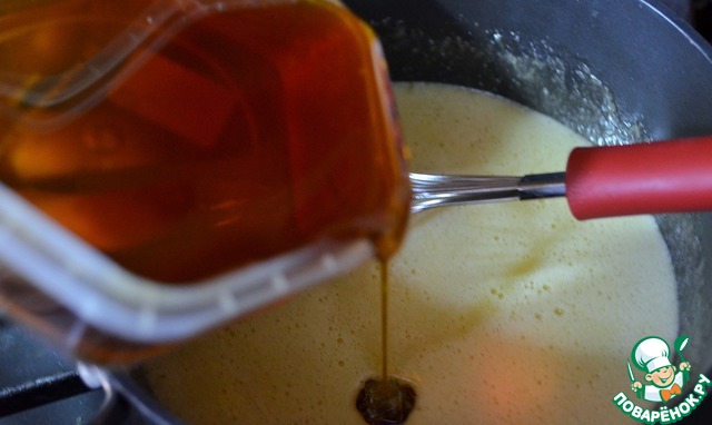 Готовим тесто : В сотейнике с толстым дном растереть сахар с яйцами. |