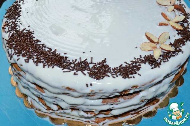 Таким образом собрать весь торт. Я собрала из 7 коржей. Украсить по желанию и возможности. У меня с этим бедААА, но благодаря кондитерским посыпкам от Dr. Oetker, у меня получился отличный торт. Убрать в холодильник для пропитки, на 12-20 часов. |