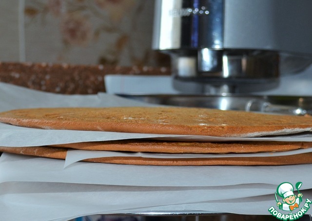 Отпекать при 180 градусах 6-8 минут. Готовые коржи переложить пекарской бумагой. |