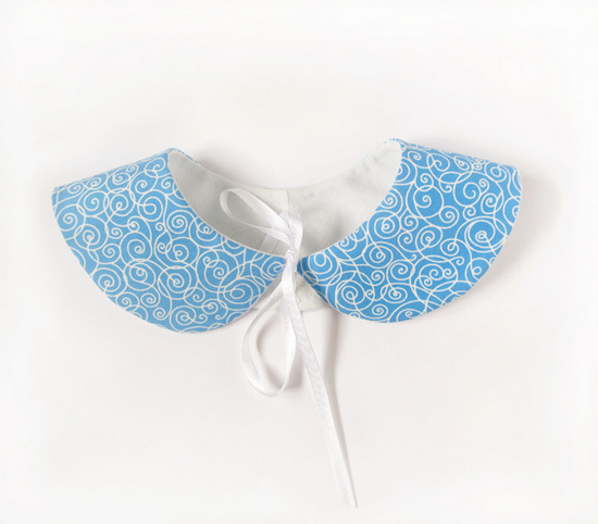 В компании с первым воротником шила этот - горошковый. Совершенно другая выкройка: воротник состоит из двух отдельных частей, которые сшиты на машинке (функция "петли"). Завязывается сзади на атласную ленточку.