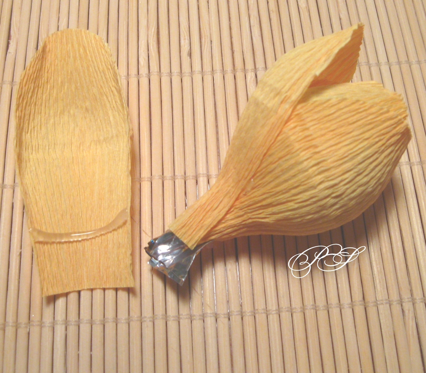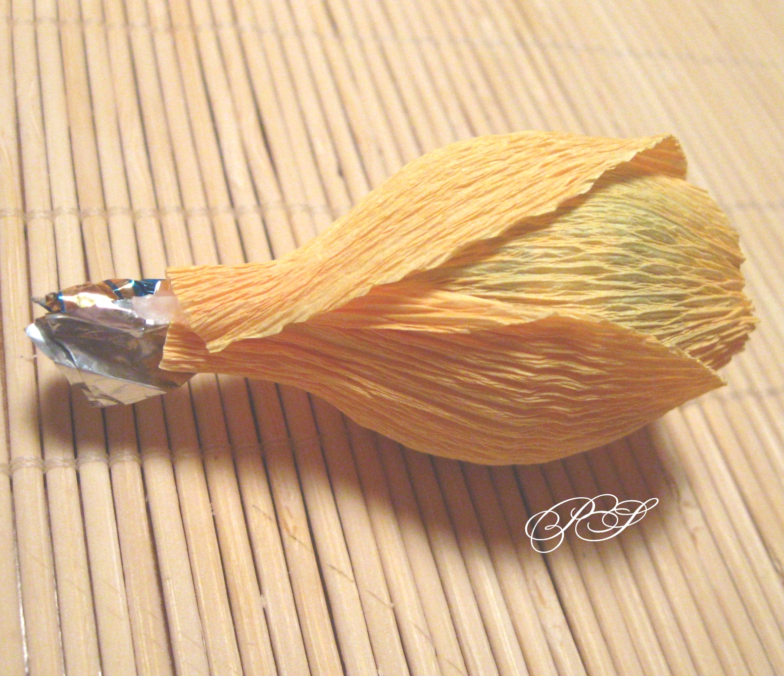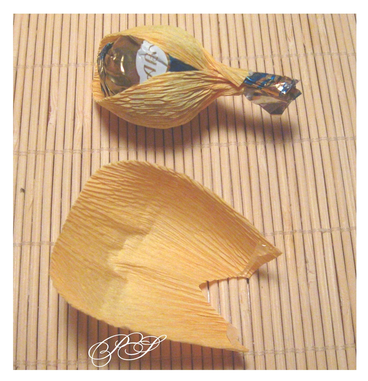 Первый ряд - 1 лепесток. Его высота 1,5 деления гофры. Ширина - примерно 3-3,5 см. (Зависит от величины конфетки, это определяла опытным путем)
