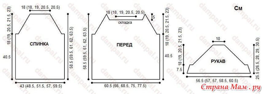 Рукава также вяжутся снизу вверх. Дополнительная ширина убирается сборкой по верхнему краю.