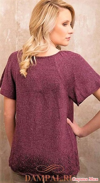 Вязаная летняя кофточка свободного силуэта украшена по низу ажурным рисунком и имеет складку на вырезе горловины спереди.