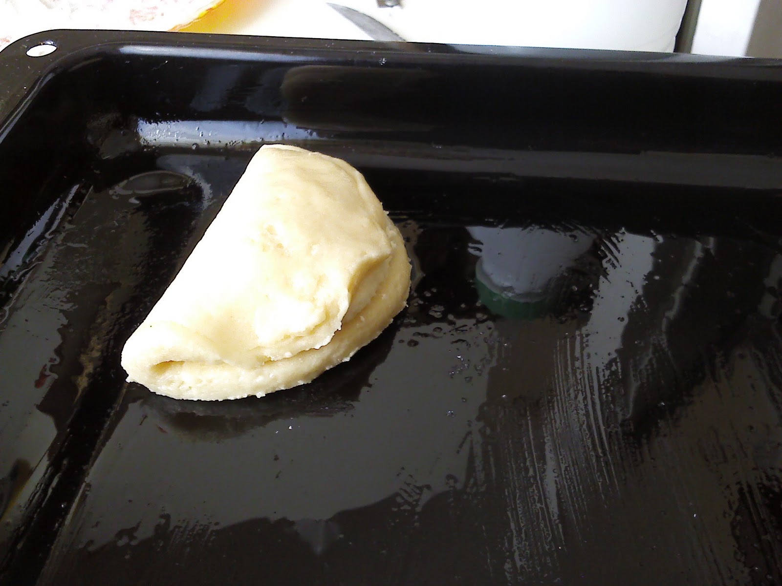 Достаем из холодильника тесто и раскатываем его в лепешку 0,5-0,7 см (можно конечно больше 1-1,5 см, тогда они получатся такие, как на первой картинке, полураскрытые. Я люблю закрытые в сочной начинкой внутри)