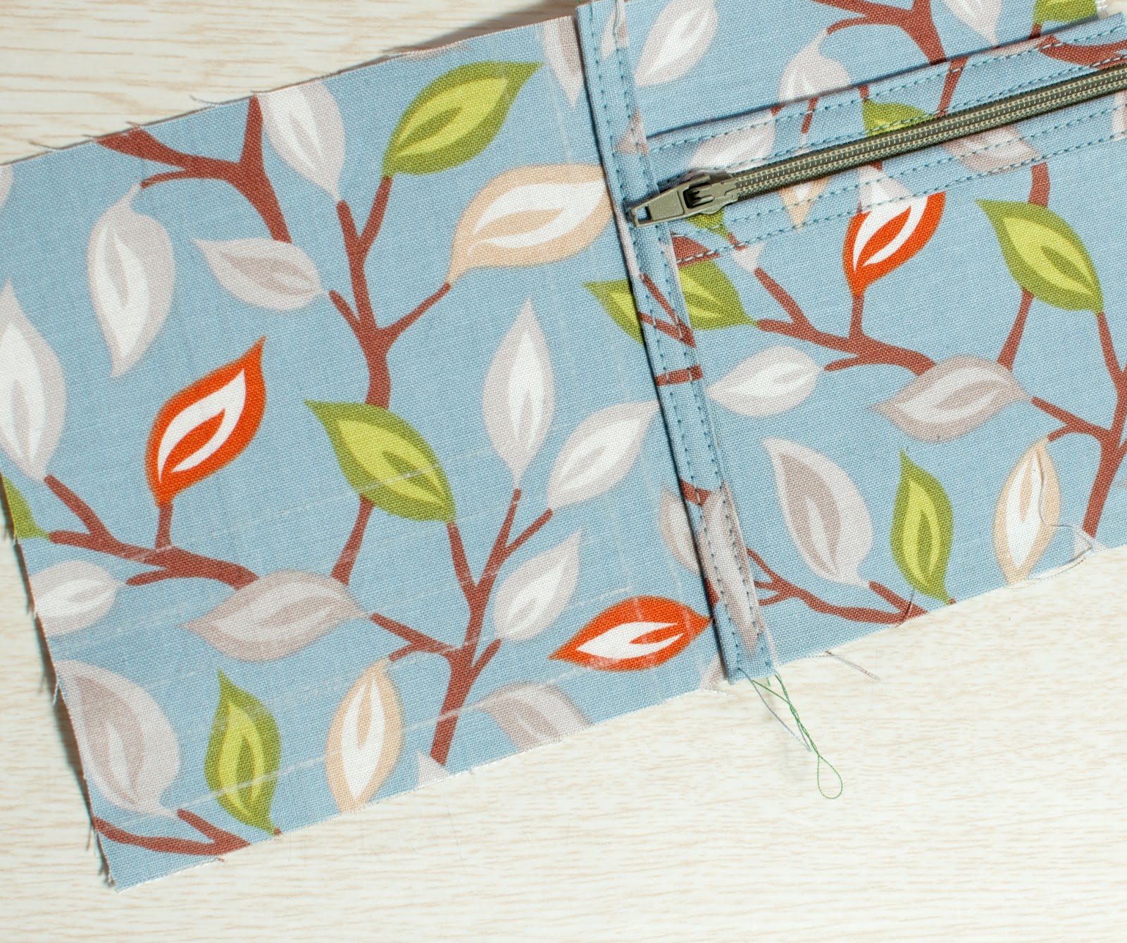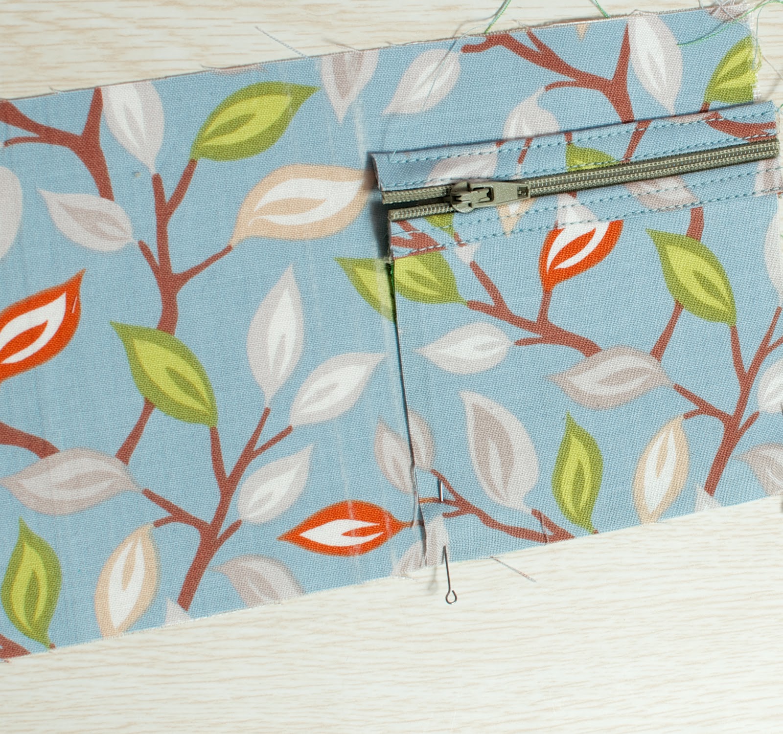 На подкладе загибаем 1 см внутрь (у нас при раскрое подклад был на один см больше основной ткани), совмещаем изнаночными сторонами две детали и между ними вставляем молнию. Прокладываем строчку.