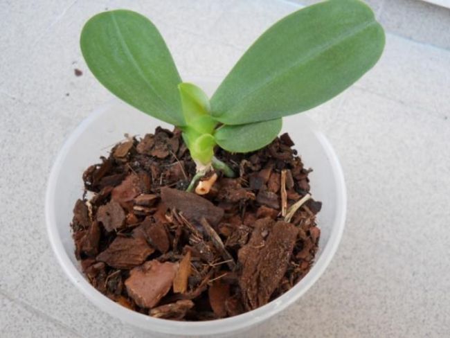 Как только «детка» дала корни и сформировала полноценные листочки, следует подготовить небольшую прозрачную ёмкость в качестве цветочного горшочка или коробочки, а также сосновую кору в виде некрупных кусочков, мох сфагнум и качественный древесный уголь. Вглубь стаканчика нужно аккуратно вставить корешки отсоединённого отростка, а затем заполнить ёмкость смесью на основе коры, угля и сфагнума, которая укладывается между корешков «детки». Уплотнять субстрат нужно осторожно. Высаженный росток можно обеспечить надёжной опорой.