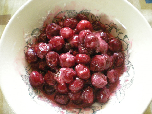 [показать]Вишню нужно разморозить, слить сок, смешать с сахаром и крахмалом.