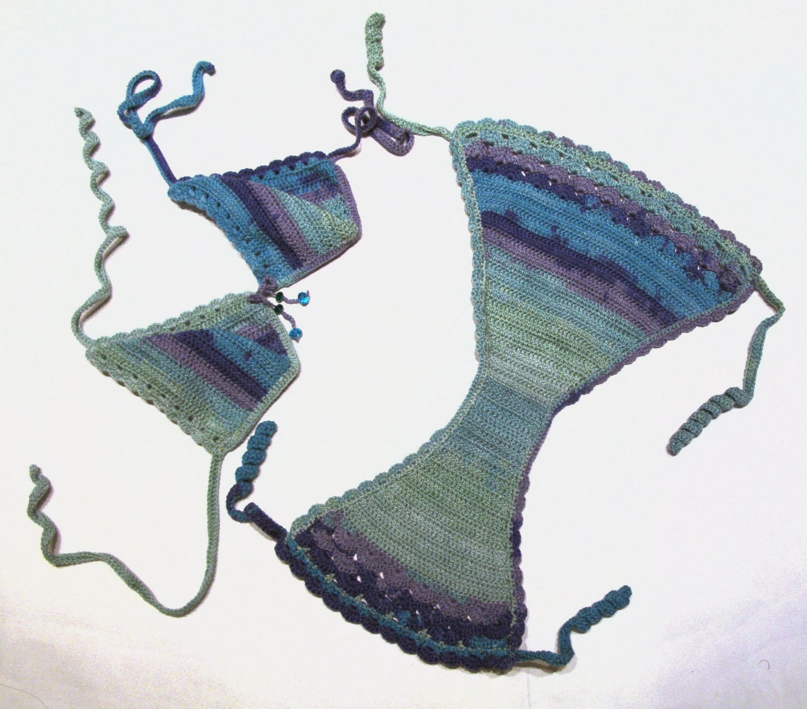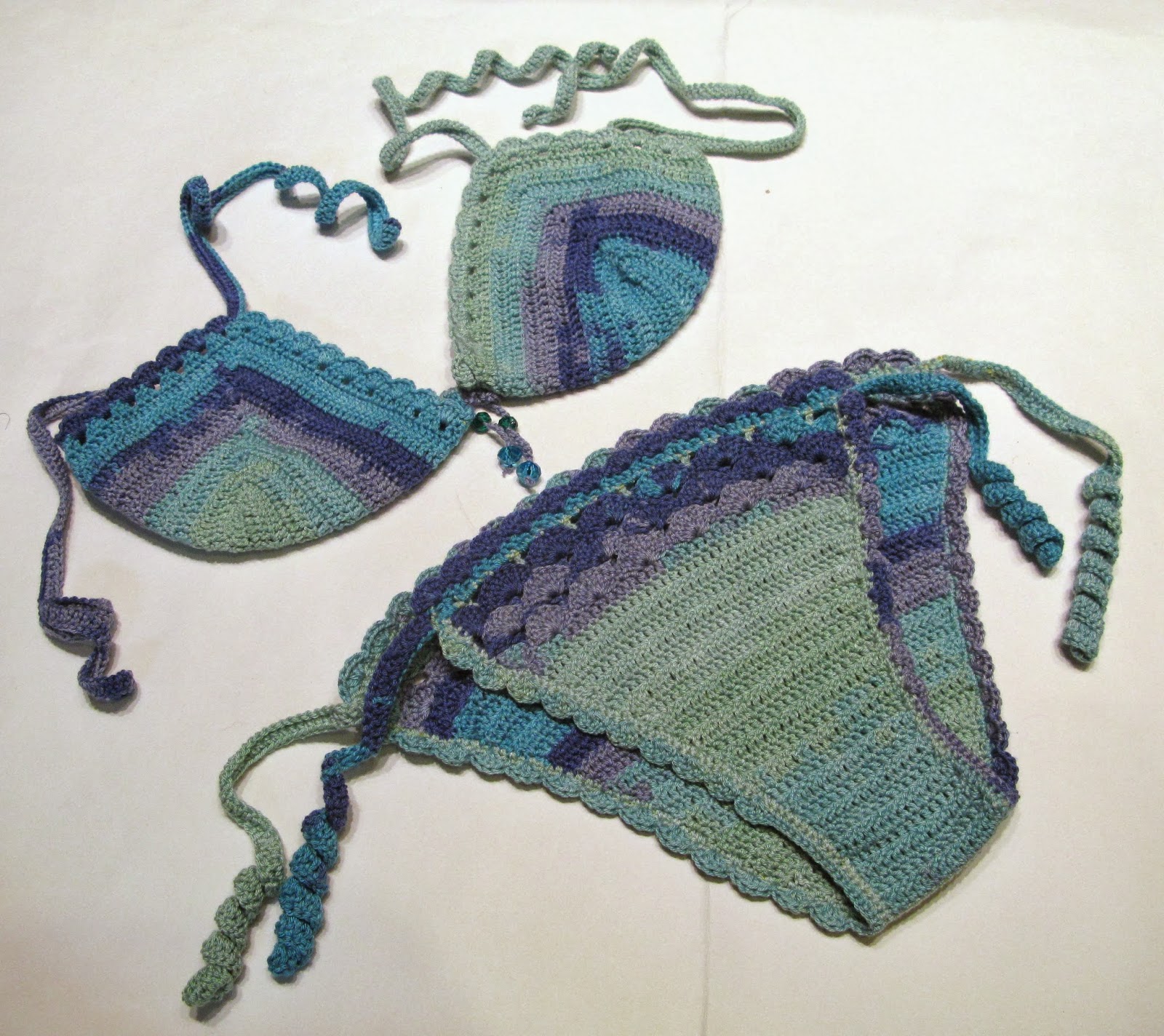 Чашечки очень выпуклые (по краям для надежности прилегания ввязана специальная резинка. В плавочках то же.) При фотографировании складывала их разными способами, для наглядности. Фото на модели обещано хозяйкой после НГ праздников.