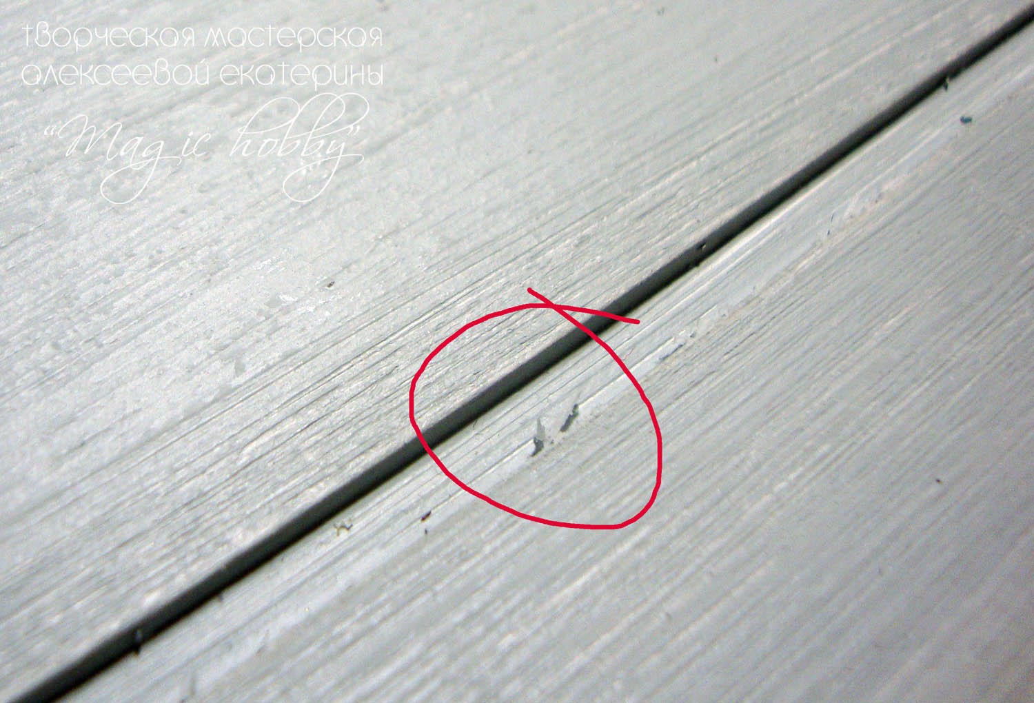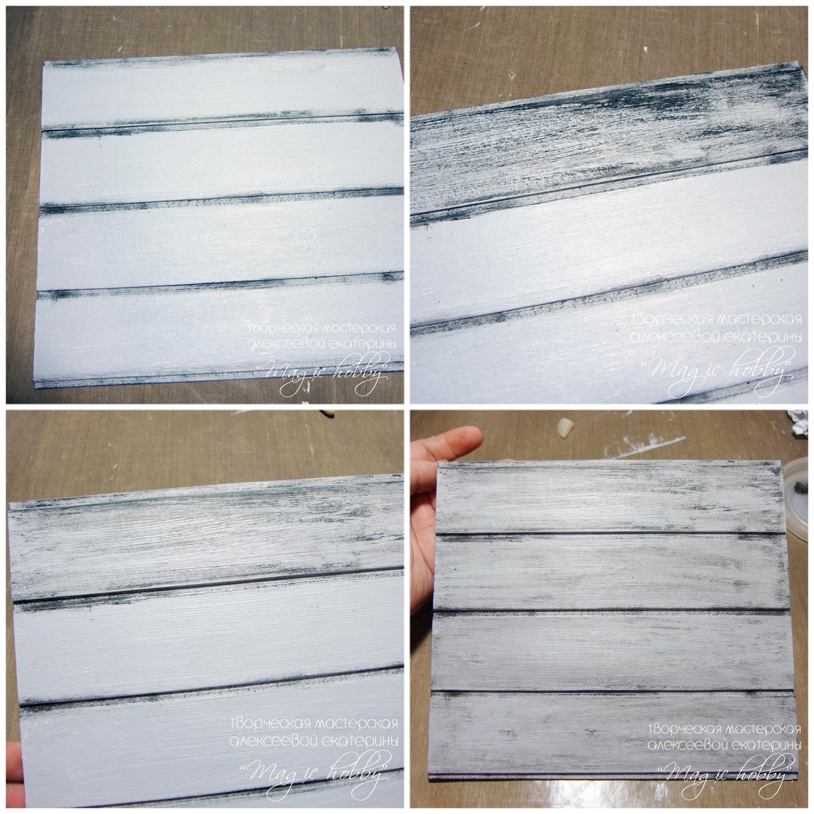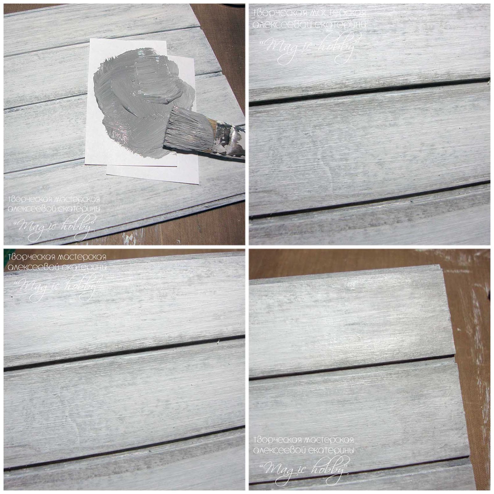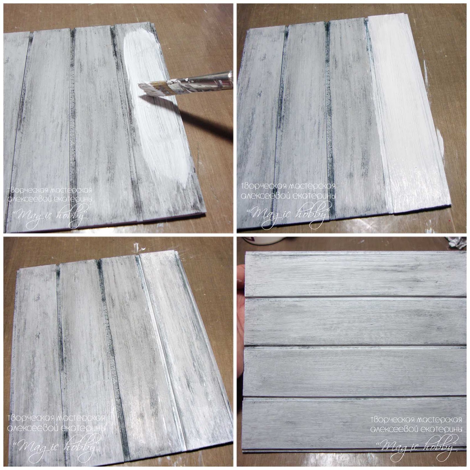 Теперь добавим еще немного фактурности. Смешиваем белую и черную акриловые краски чтобы получить темно-серый цвет. Этим цветом я тонирую так же сухой кистью промежутки между досочками и края досочек.