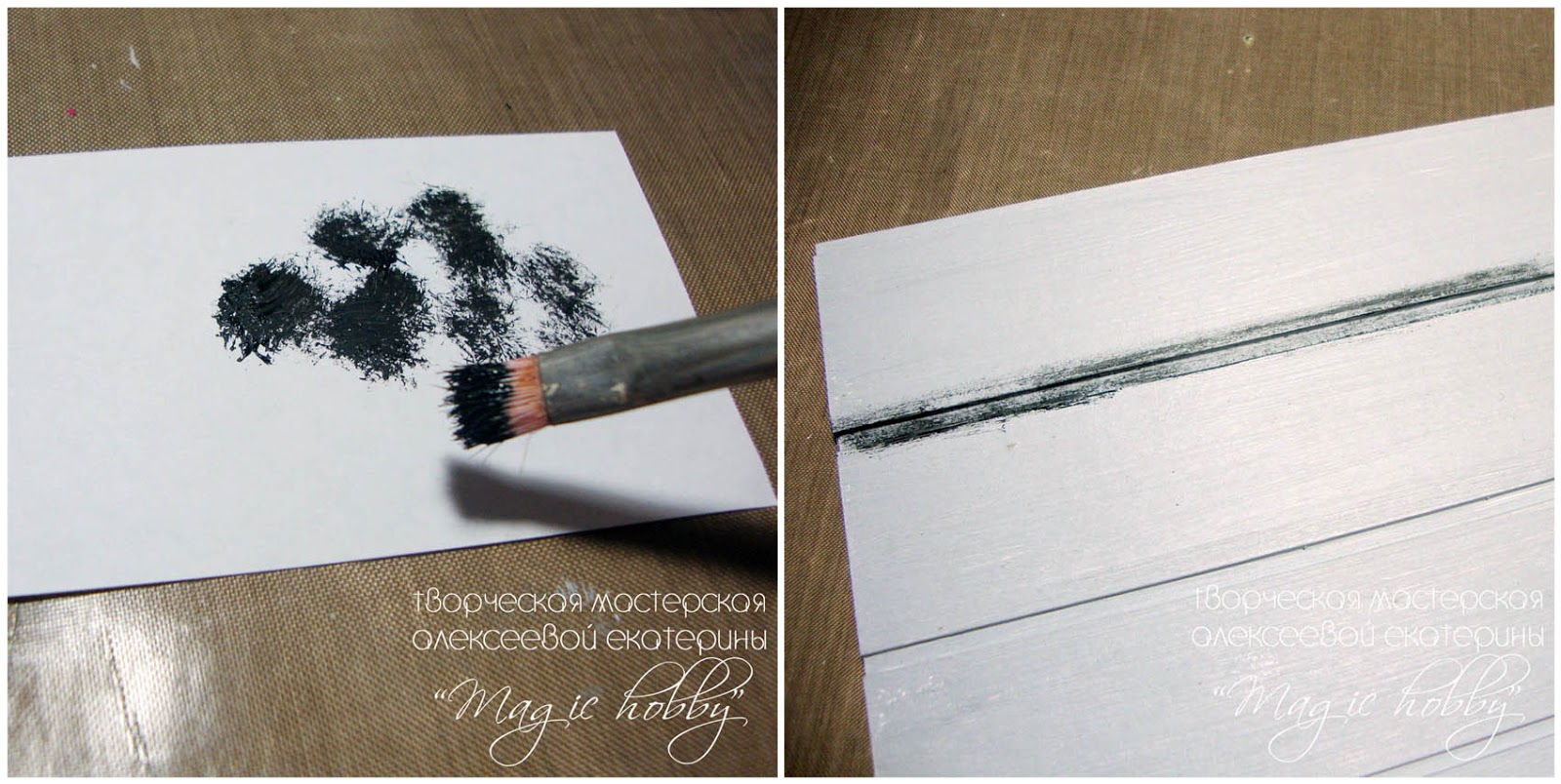 Теперь можно приступать к тонированию нашей заготовки. Черную краску наносим сухой кистью в промежутки между досочками. Смотрите, чтобы на кисти краски у вас фактически не было, промакивайте краску на ненужную бумагу.