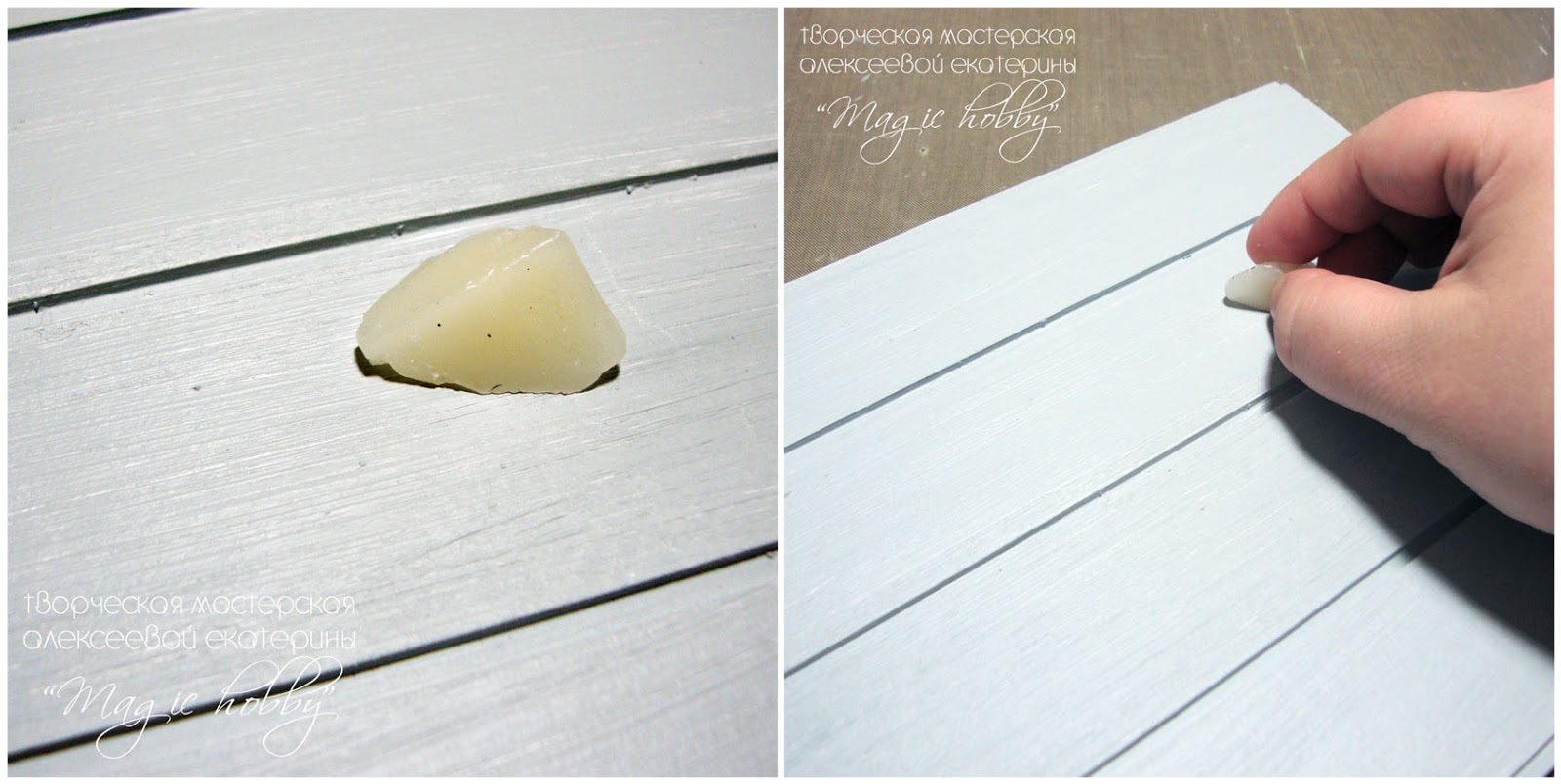 Оставляем заготовку высохнуть. После полного высыхания краски натираем нашу заготовку свечкой. Я натирала края самих досочек и буквально немного середину.