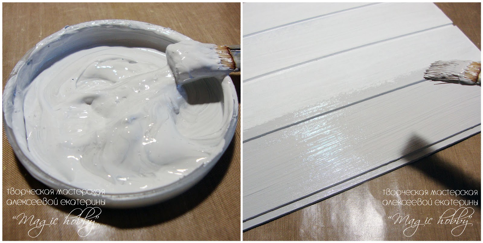 После высыхания грунта, смешиваем белую и черную акриловые краски так, чтобы получился светло-серый цвет и им полностью окрашиваем заготовку. Мазки кисти точно так же делаем в одном направлении.