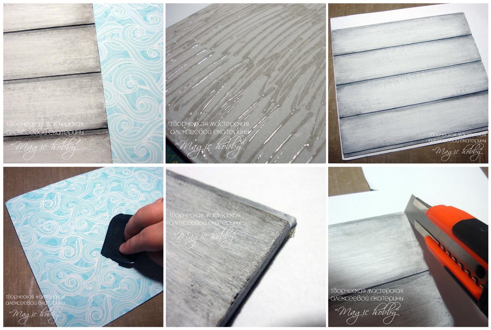 Заготовку густым слоем намазываю клеем и прикладываю к подходящему листу скрапбумаги. Разглаживаю все неровности и пузырьки воздуха. Убираем излишки клея. Когда клей подсохнет аккуратно макетным ножом срезаем излишки бумаги и получаем аккуратную изнаночную сторону.