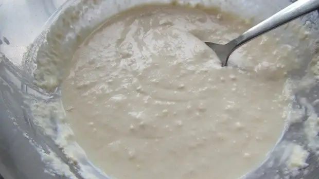 Потихонечку добавляем молоко. Все слегка перемешиваем. Тесто получается жидковатое и с комочками. Оставляем его ненадолго в сторону, пока занимаемся фруктами.