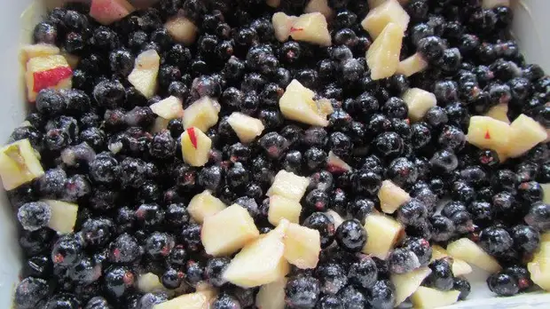У черной смородины удаляем стебельки и добавляем ее к яблоку. Всыпаем сахар и муку. Все перемешивем и выкладываем в форму для запекания.