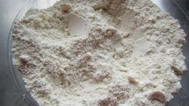 Сливочное масло режем кубиками и добавляем к муке. Кончиками пальцев протираем смесь в крошку.