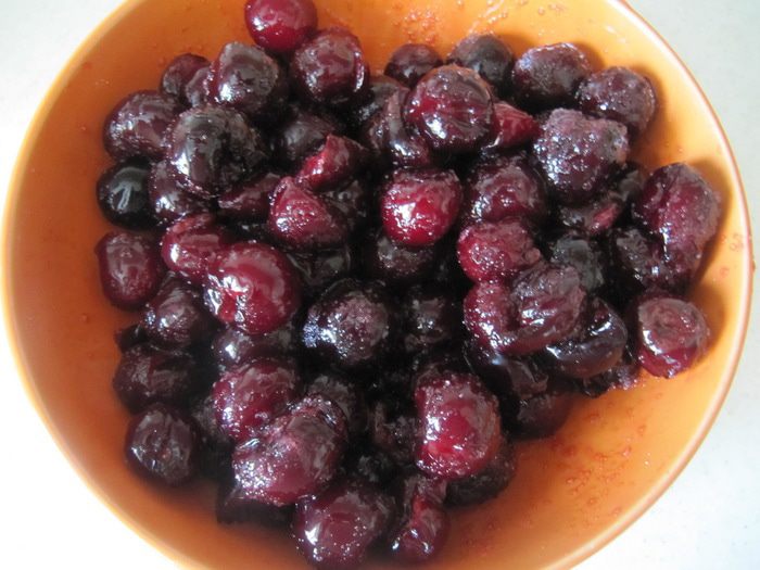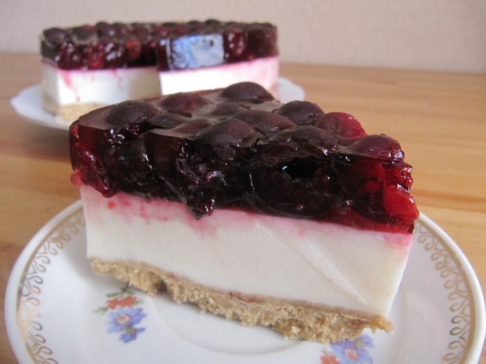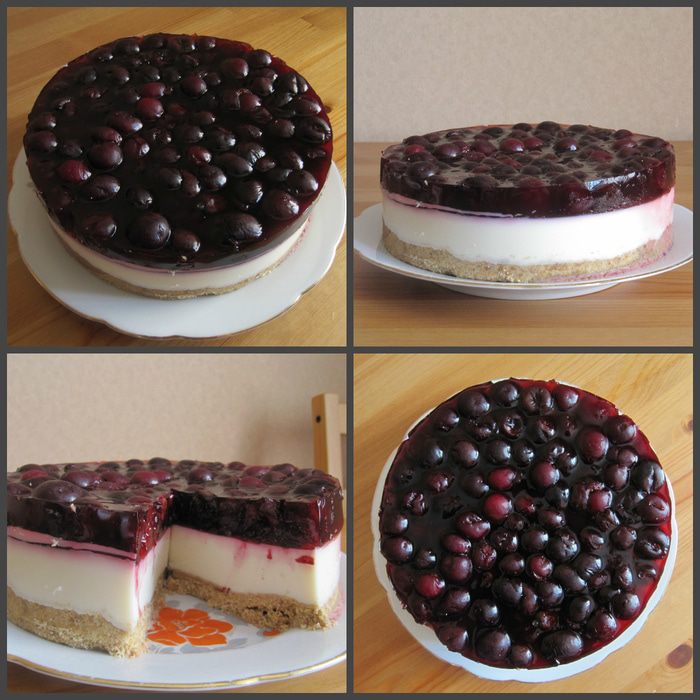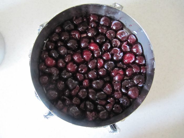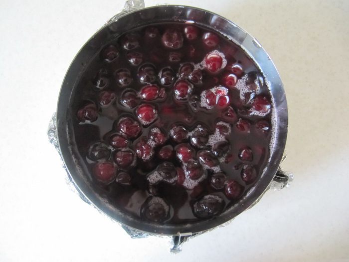 Для ягодной заливки я использовала пакетик уже готового вишневого желе для торта. Но можно заменить его и на обычный гранулированный желатин с фруктовым соком для придания цвета