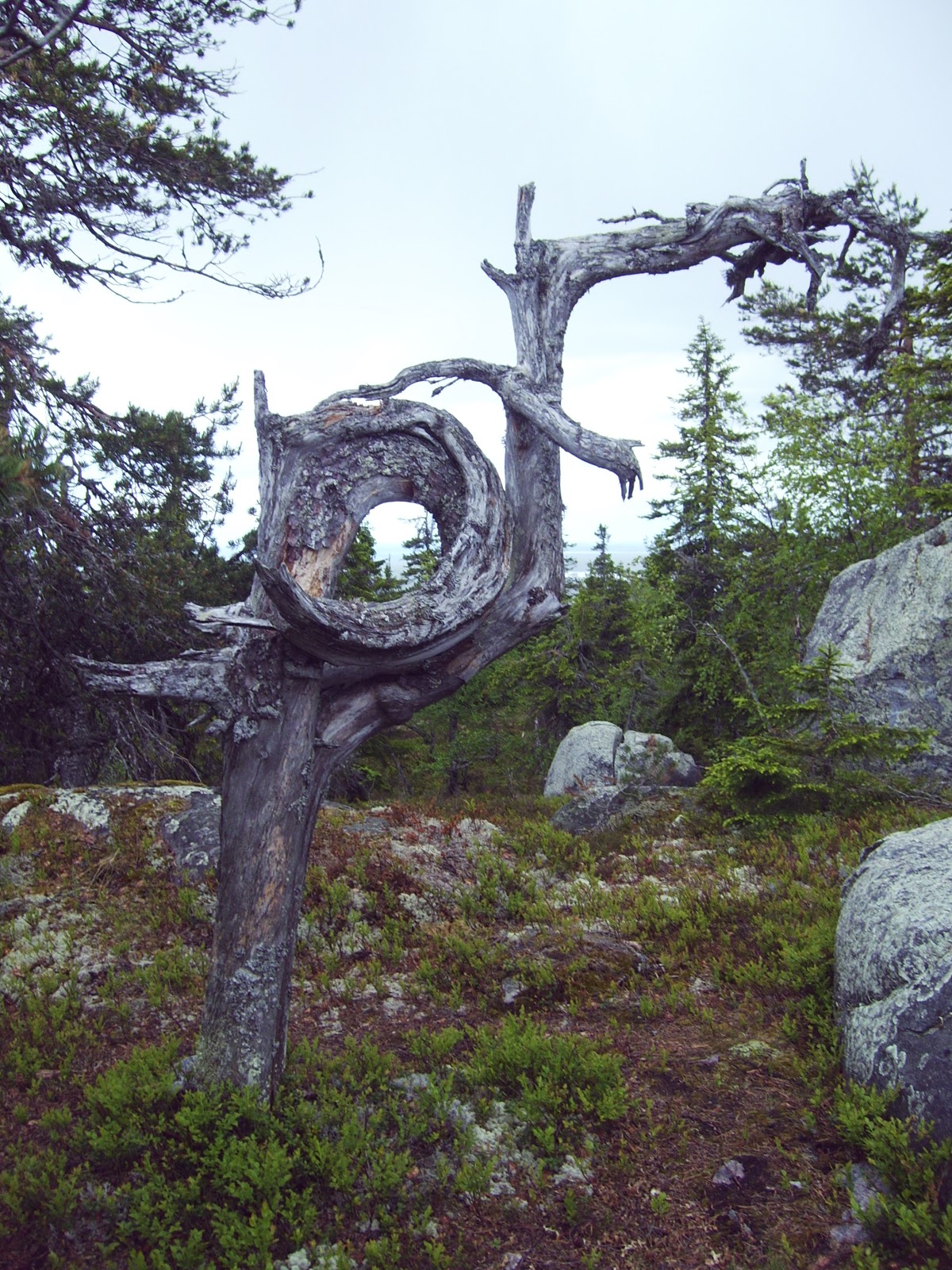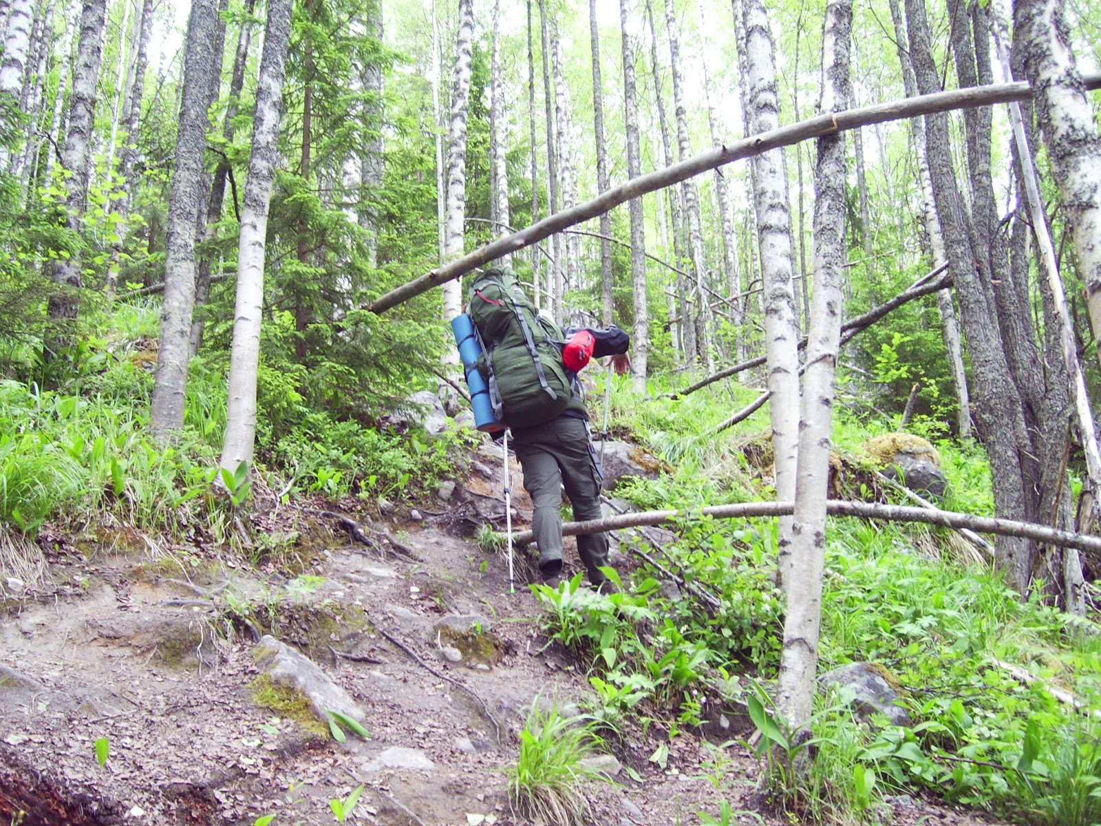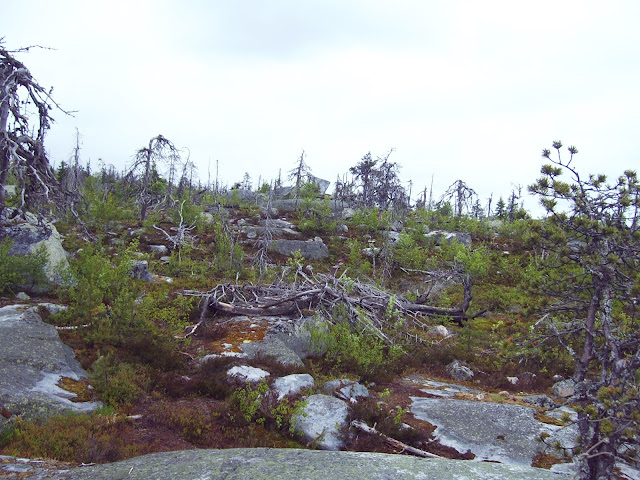 До подножия горы с юга у нас ушло в спокойном темпе 8 часов хода. Отдохнув у подножия и набравшись сил для серьезного подъема, начали штурм. Подъем с юга очень крутой, а учитывая вес рюкзаков то идти было тяжело, используя все конечности. Подъем занимает не очень длительное время. И сразу из зоны леса вы попадаете в каменное царство, кривых деревьев и сейдов.
