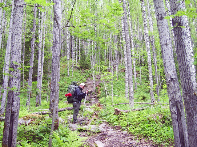 Возвращаясь обратно в лагерь на озеро Белое, пошли по тропе от лестницы решив, что куда нить да выведет, все равно гуляем. И тропа вывела к живописному озеру со скалами, место называют «оазис». Место так понравилось, что было принято «судьбоносное» решено переселится сюда с Белого. Тропа вывела прямо на Белое. Отобедав и собрав всю снарягу, в ночи, хотя в 00.00 уже рассветало, пошли в «оазис». Тропа идет по верху скал над озером, виды просто захватывающие. Мы по долго стояли и любовались рассветным небом.