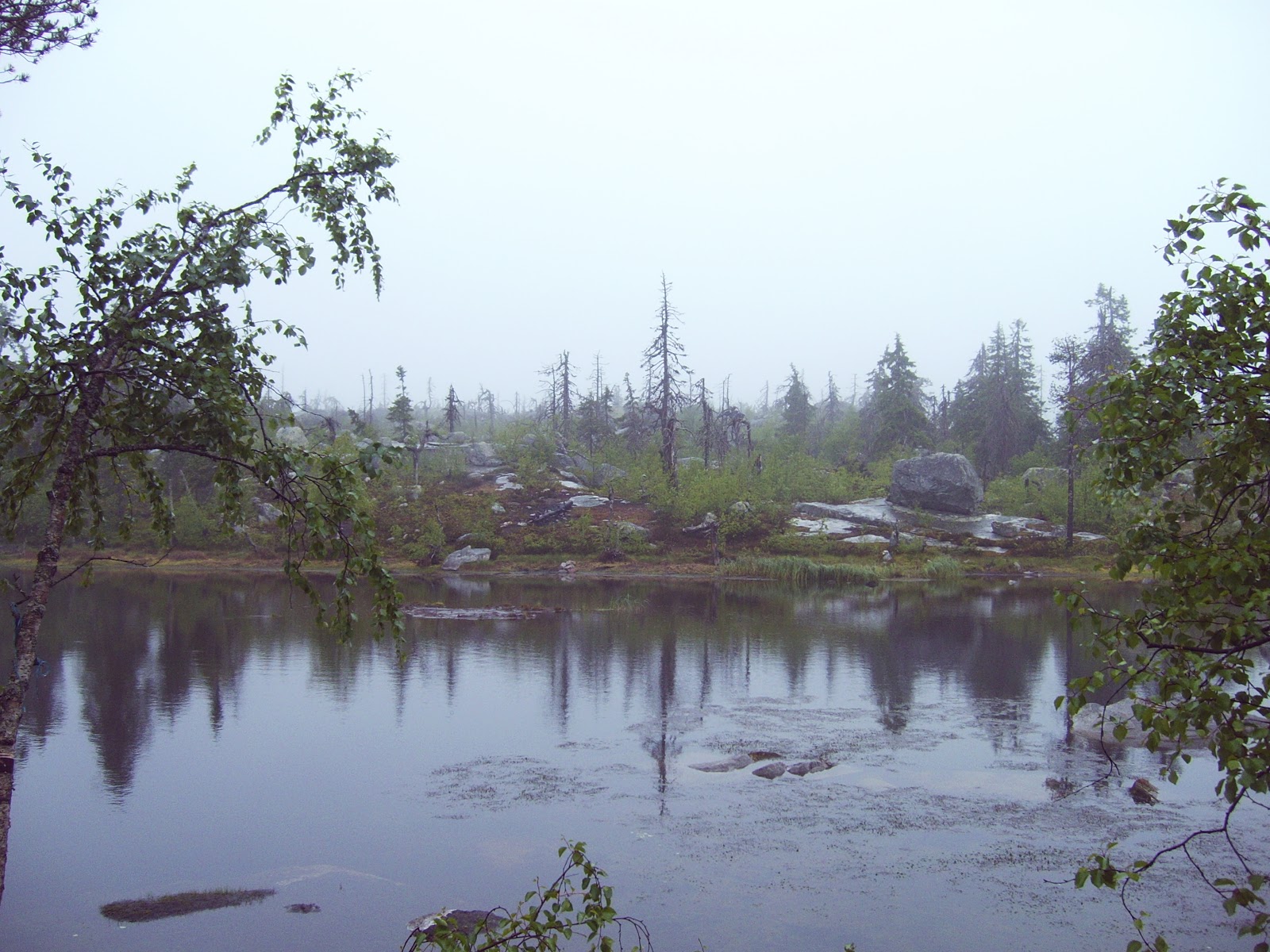 Не успели мы подняться на гору как начался дождь с сильным ветром, так нас встретила гора, и продолжалось это буйство природы до следующего дня. Это было настоящее испытание для нас и нашего снаряжения. Стоянку решили организовать на озере Белом возле распиленного камня. После того как мы развели небольшой костерок и приготовили поесть. Решили забраться по палаткам и поспать так как всю ночь были на марше. Я будучи в непромокаемом костюме весьма спокойно уснул, палатка при этом от ветра и дождя ходила ходуном и грозилась улететь, однако я был внутри и своим весом и весом своего рюкзака держал ее от этого. Меня разбудил крик напарника, на мой вопрос, что случилось? Выяснилось, что его палатка с худым дном промокла снизу и промок спальник, а учитывая, что пока ставили лагерь под дождем он изрядно промок и сам, то заснуть он не смог, зато замерз до судорог. Стало понятно, что ситуация чрезвычайная, а ливень между тем только набирал силу. Пришлось срочно бежать на разведку окрестности для установки нового лагеря, подходящее место нашлось в ельнике на другой стороне озера, туда и переселились.