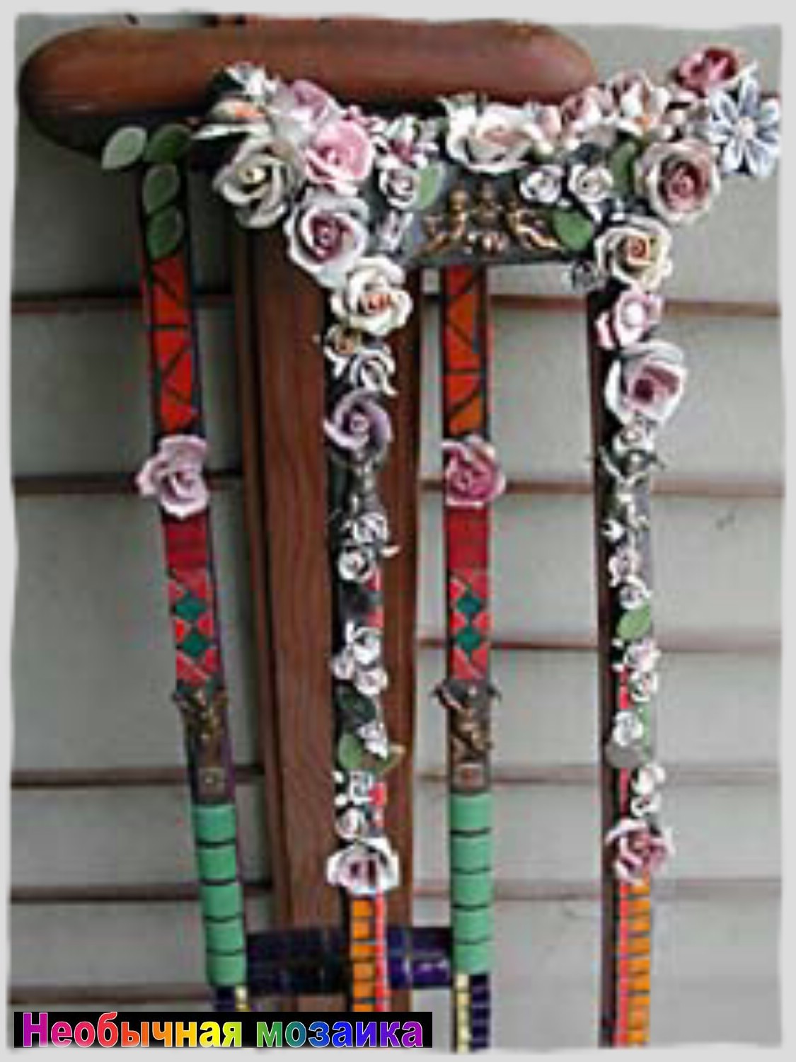 Костыли, купленные за доллар на распродаже. Покрытые декоративной мозаикойони смотрятся гораздо веселее.
