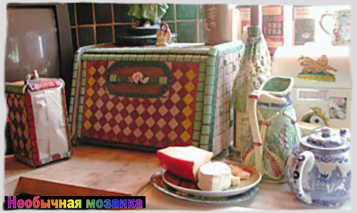Кухонная утварь: мозаичные салфетница, хлебница, кастрюля, бутылки и даже тостер.