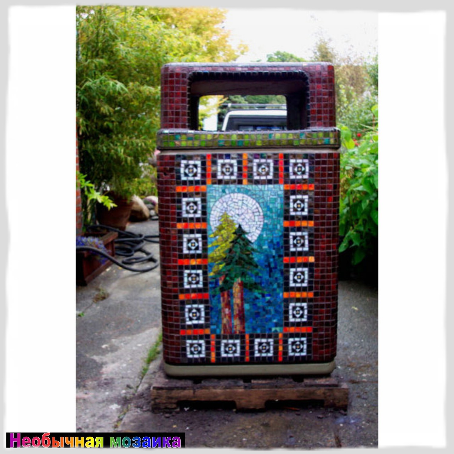 Помоечный контейнер во дворе тоже покрытый мозаикой.