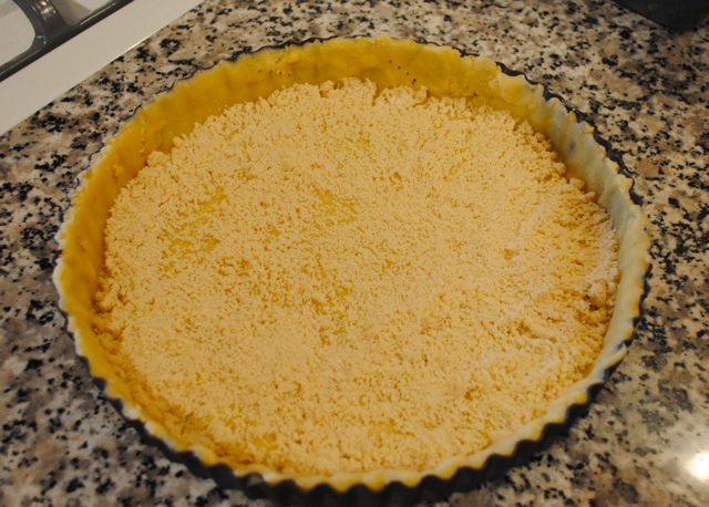 Застилаем форму для тартов тестом, подравниваем края. Накалываем тесто в нескольких местах вилкой. Охлаждаем форму с тестом полчаса в холодильнике.
