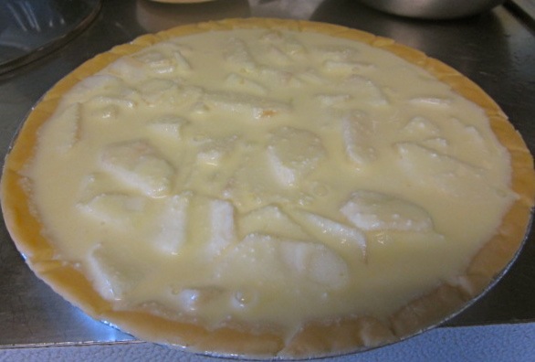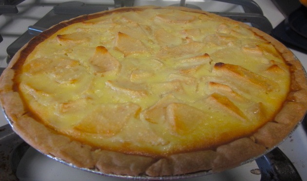 Кладем в основу для пирога яблоки (основа должна быть заполнена яблоками процентов на 70). Заливаем сырной смесью. Разравниваем верх лопаткой.
