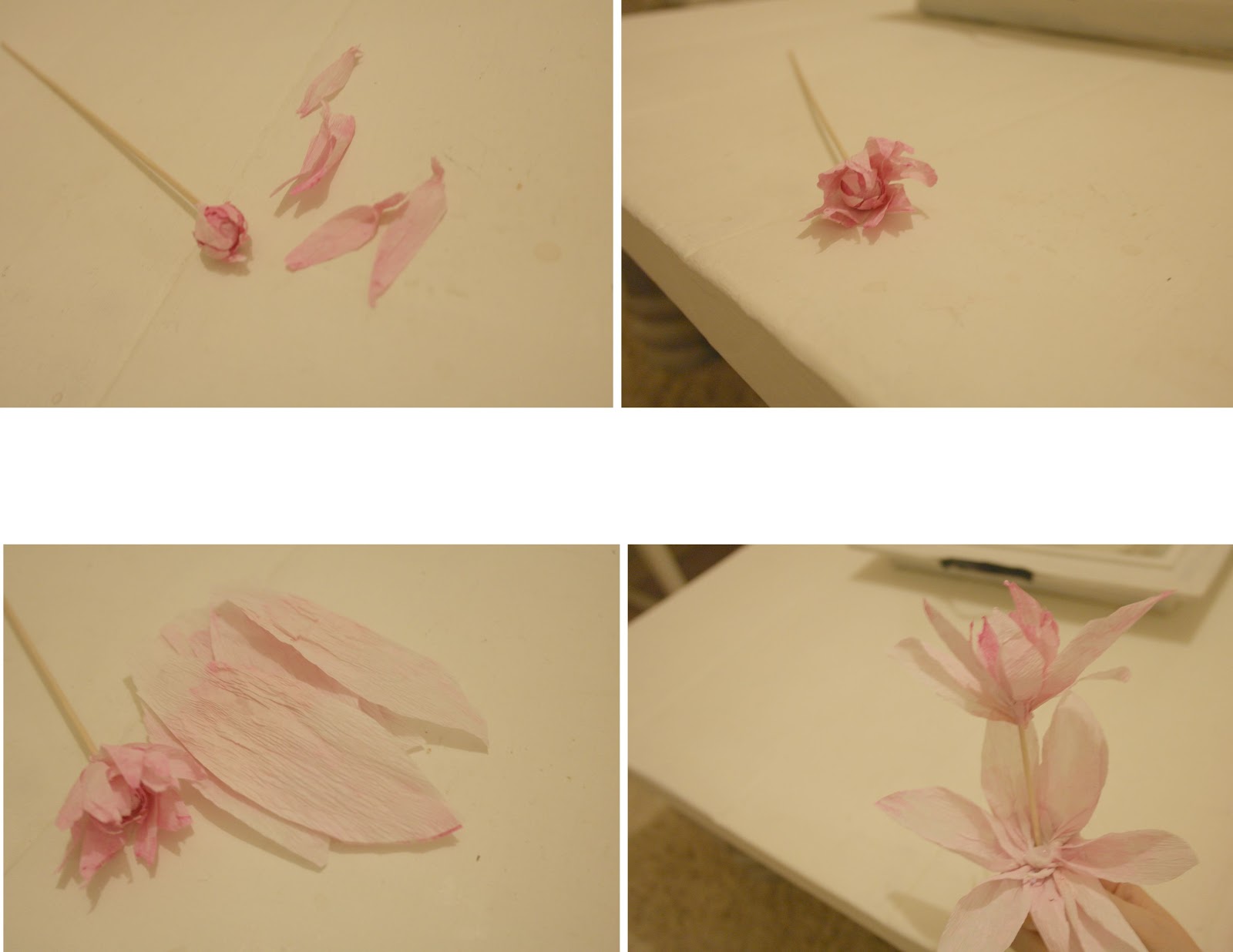 Затем вырезать длинные широкие лепестки и прикрепить их к шампуру. Затем вырезать круг из бумаги и сделайте отверстие в середине, приклейти на него лепестки, круг скользит по шампуру и вы можете доклеивать таких кружков столько,сколько Вам нужно,а затем закрепите кругом белого цвета.